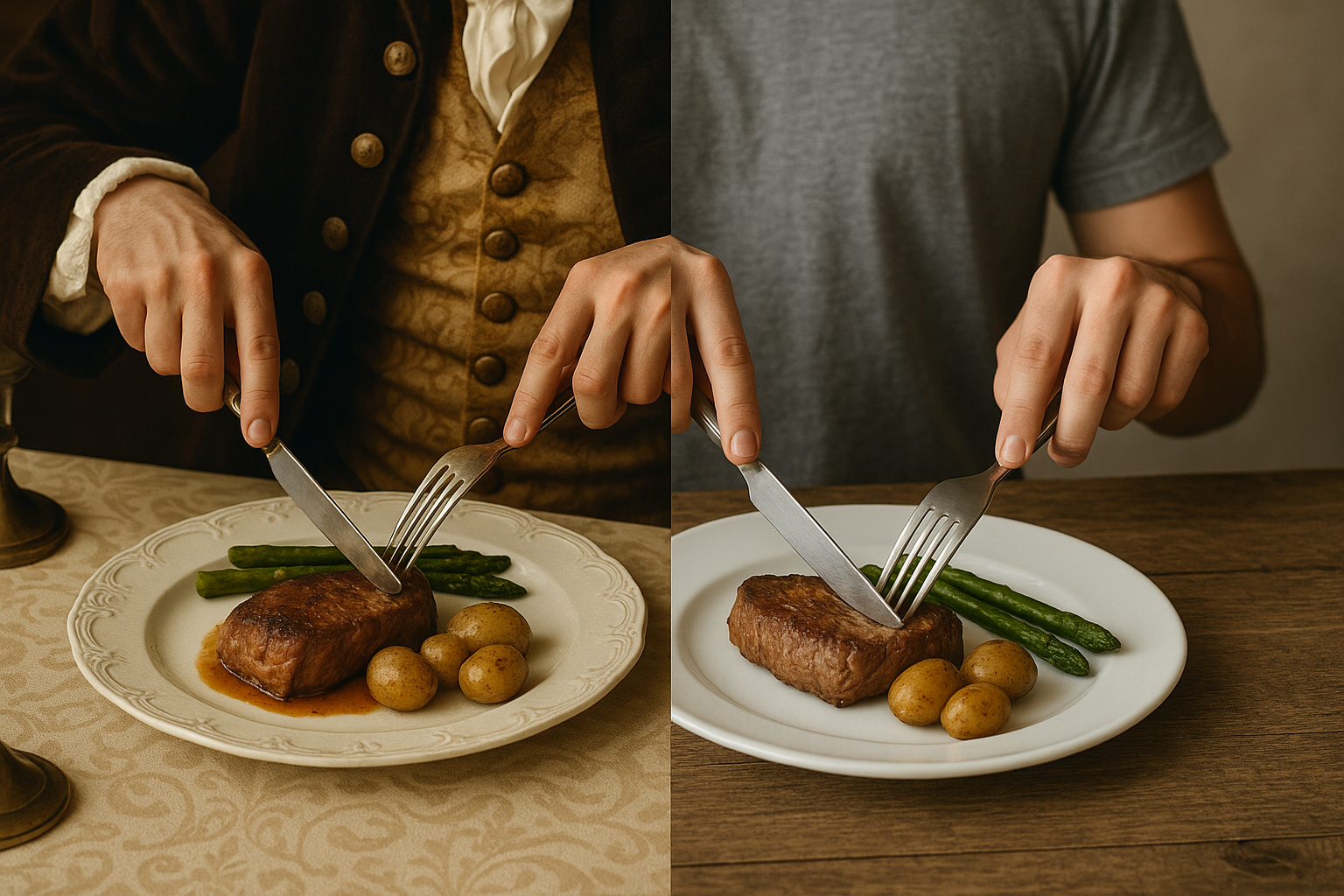La grande assente della tavola antica e medievale era la forchetta. Sebbene esistessero degli strumenti a due punte per tenere ferma la carne mentre veniva tagliata, l'idea di portare il cibo alla bocca con essa era considerata strana e persino immorale in gran parte d'Europa.